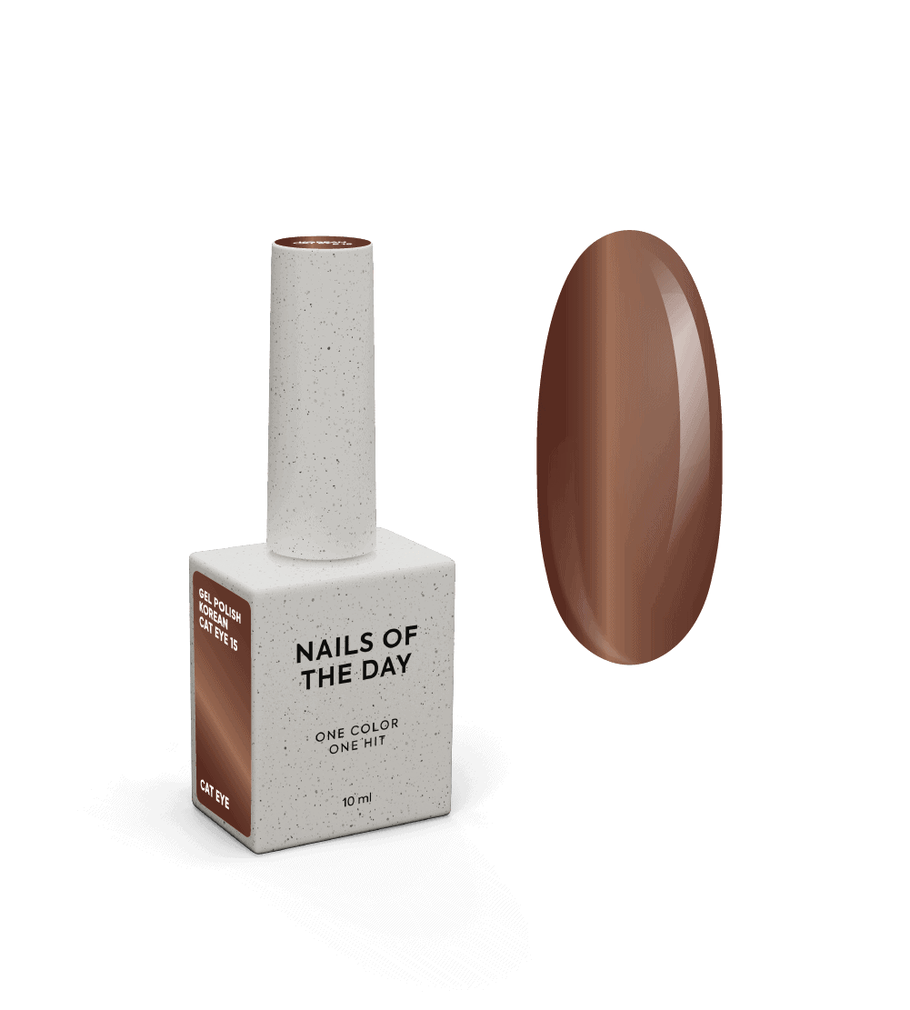 NAILSOFTHEDAY Korean Gel polish Korean cat eye #15 is warm, caramel-toned brown with soft cat-eye shimmer. It has a creamy, golden undertone that gives it a rich and inviting feel, reminiscent of toffee. The magnetic effect adds depth, creating a glowing, multidimensional finish that shifts with the light. This shade is perfect for those who love neutral, earthy tones with a touch of elegance and sophistication.
